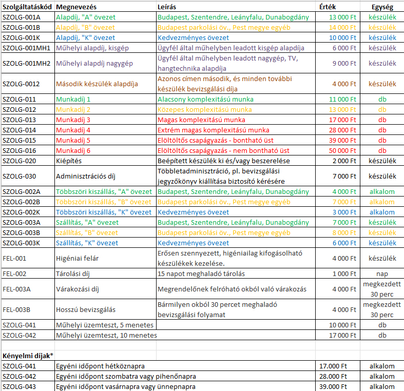 A feltűntetett árak bruttó összegek, és csak tájékoztató jellegűek. A tényleges javítási díj függ többek között a hiba jellegétől, a javítás összetettségétől, a helyszín megközelíthetőségétől (útviszonyok, parkolás), valamint környezeti tényezőktől (pl. a készülék és környezete nehezen hozzáférhető illetve szennyezett). A valós árajánlat előzetes bevizsgálást követően kerül kiadásra.